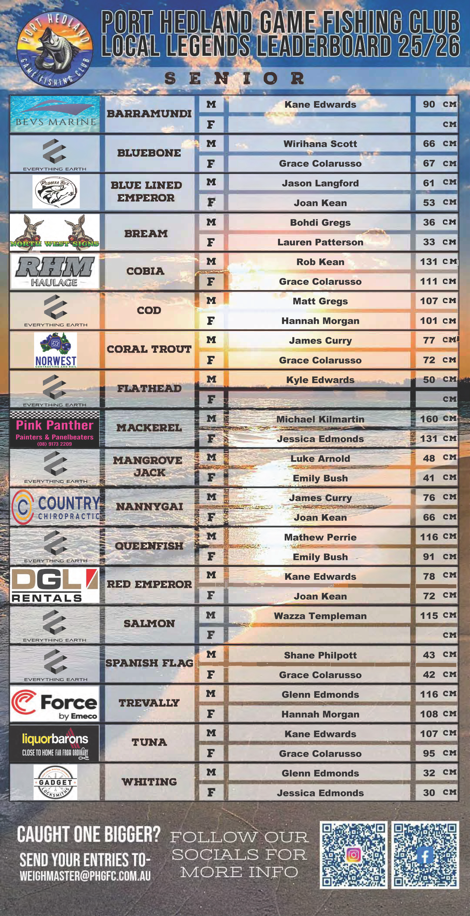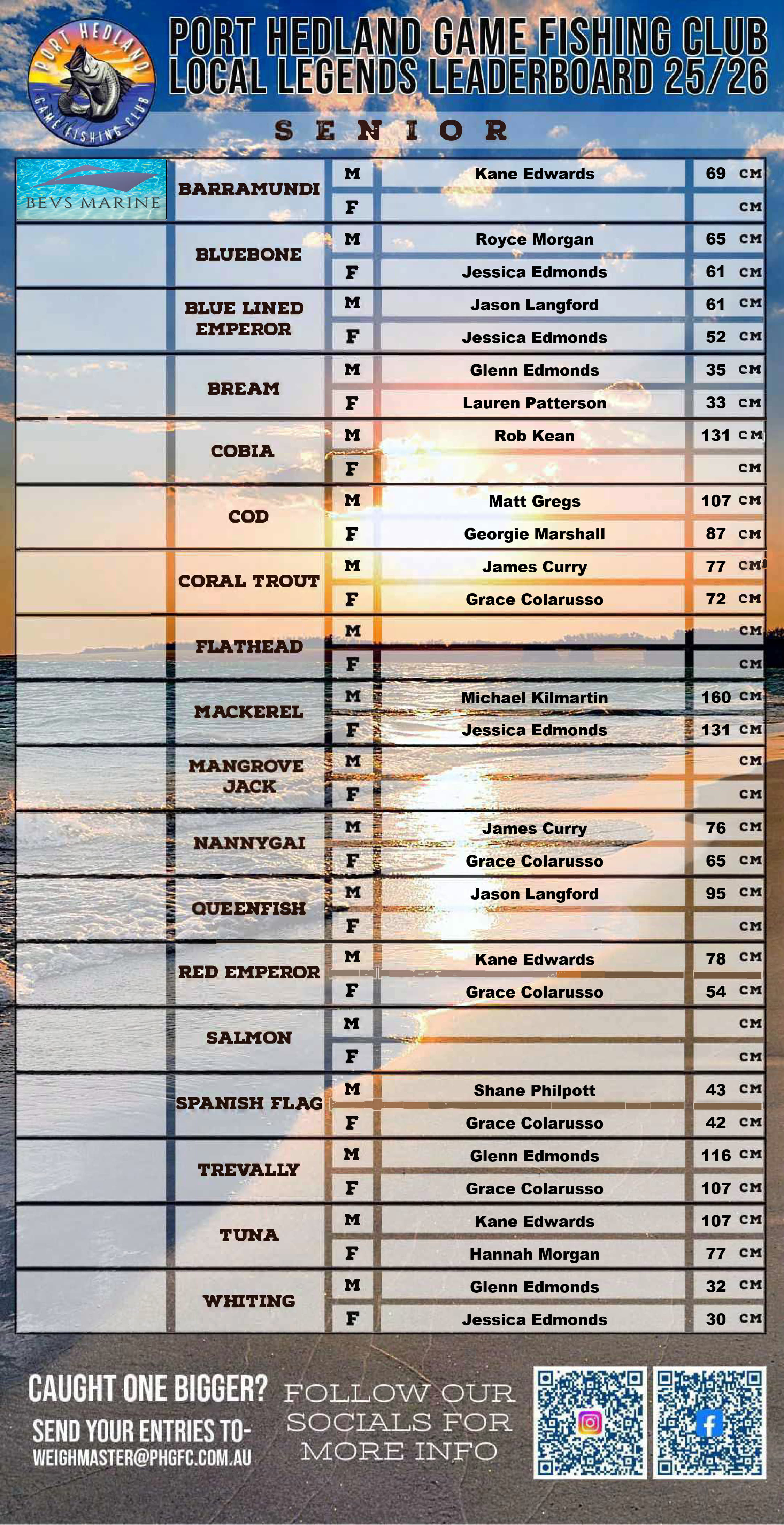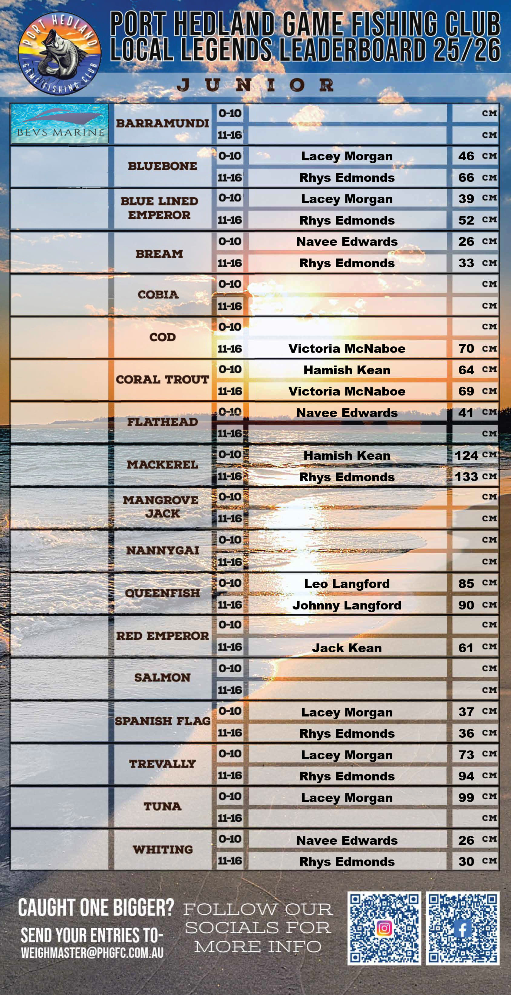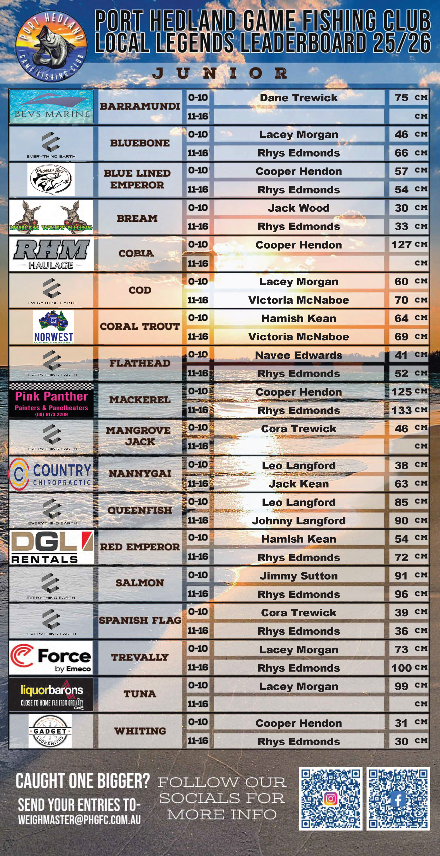 These will be updated fortnightly. Don't forget to enter any size fish regardless of whether it's smaller than those listed here. Every centimetre of every fish registered, counts towards the overall Club Champions at the end of the membership year.